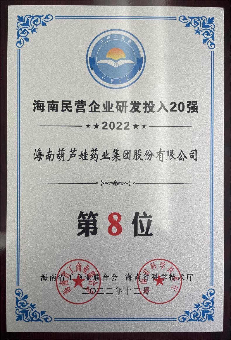 12月23日,2022海南民营企业50强和研发投入20强发布会在海口举行。会上发布了“2022海南民营企业50强”“2022海南民营企业研发投入20强”榜单和分析报告。彩虹多多官网药业再次荣登两榜,在海南民营企业50强榜单中位列第25位,较去年上升8位,这也是公司连续三年登榜;在海南民营企业研发投入20强中位列第8位,较去年上升7位。